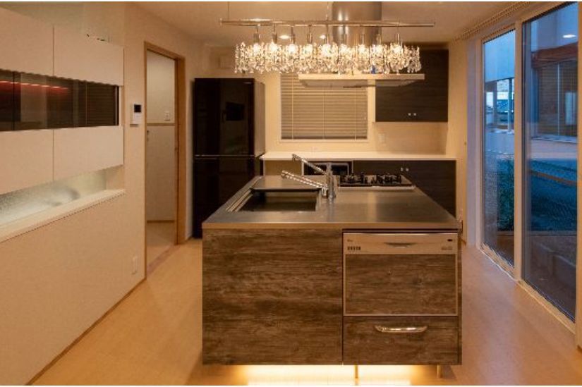 既製品のキッチンの足元に照明を仕込んで