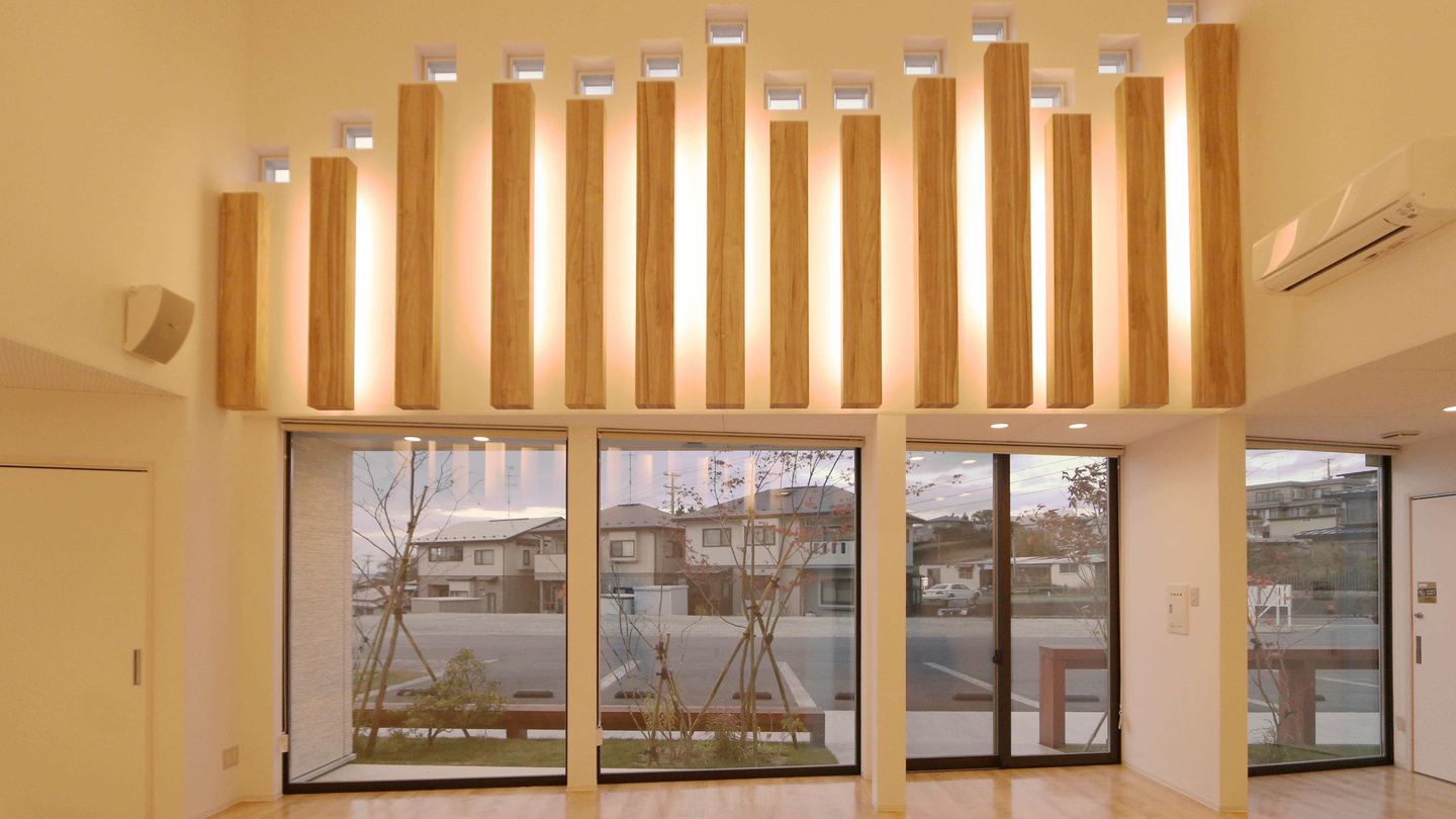 ホールなので壁面の反射音をスクランブルしたかったのと、意味のあるランダムな光のアクセントを与えたかった。室内から見たときに左回りに音階を表すように3方壁にガラスブロックを配置しました。曲は施設の理念の”寄り添うこと”といえば”Close to you”です。さらに間接照明を絡めたので豊かな空間に仕上がりました